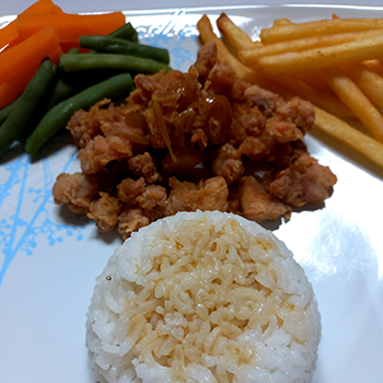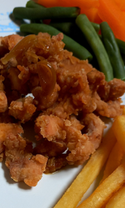 Ayam fillet bagian paha digoreng dengan tepung crispy dan disajikan dengan saus mentega.