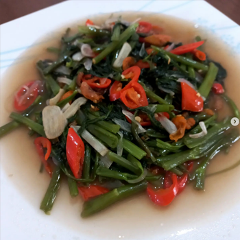 Kangkung segar ditumis dengan bawang putih dan potongan cabai merah.